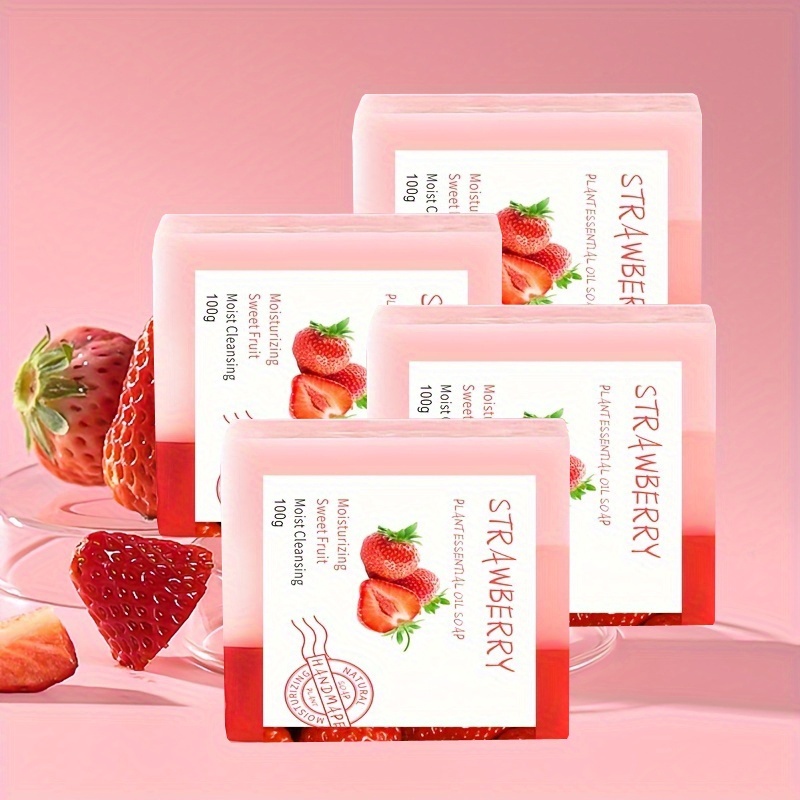 3-Color Strawberry Soap 4pcs Set, Handmade Plant Extracts Essential Oil Strawberry Soap Deep Cleansing Face, Hands, Body Moisturizing, Suitable for Men and Women, Christmas Gift